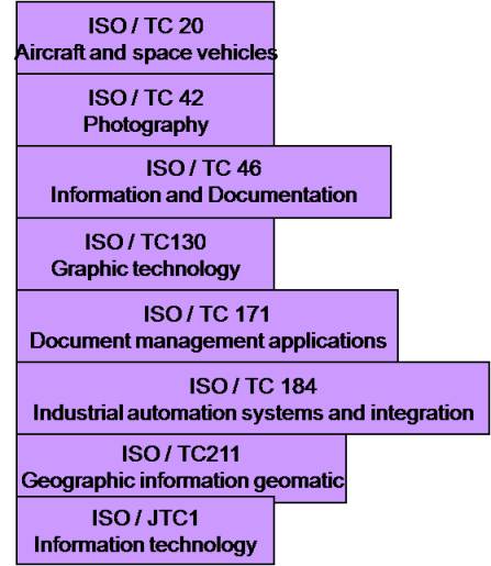 Les organismes de normalisation ont une organisation hiérarchique, structurée par métier. Cette organisation ne se prête pas bien à l‘émergence de normes transverses et multiformes comme l'archivage numérique, chaque métier ayant tendance à trouver des solutions propres même si le problème à résoudre est le même que pour d'autres métiers. Ainsi l'ISO compte plus de 200 comités techniques (nommés TC pour Technical Committee), eux-mêmes subdivisés en un certain nombre de sous-comités. Un nombre important d'entre eux s'intéresse à des activités au cours desquelles des documents numériques, des images, des plans, des descriptions d'objet à deux ou trois dimensions..., à conserver durablement seront produits.