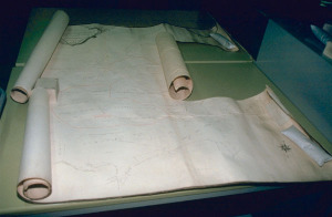 Ce plan était enroulé sur un noyau de carton acide. Toute la partie du document qui est restée en contact prolongé avec ce carton a pris une coloration plus foncée. Cliché A. Giovannini. |