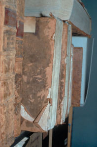 Cette reliure fragile a été endommagée par le frottement avec les autres volumes. Par ailleurs, l'étagère est très mal rangée, de sorte que l'entassement des volumes peut provoquer d'autres types de dommages mécaniques. Cliché A. Giovannini. |