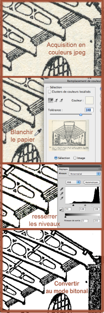 La figure montre les étapes principales de la préparation à la bitonalisation. C'est en quelque sorte une “extraction de l'encre” de la gravure imprimée.