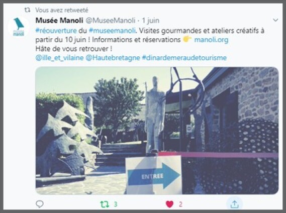 Des partages sur notre fil d’actualité afin que les abonnés voient l’information. Ici, il s’agit d’un retweet du musée Manoli qui est géré par notre collectivité.